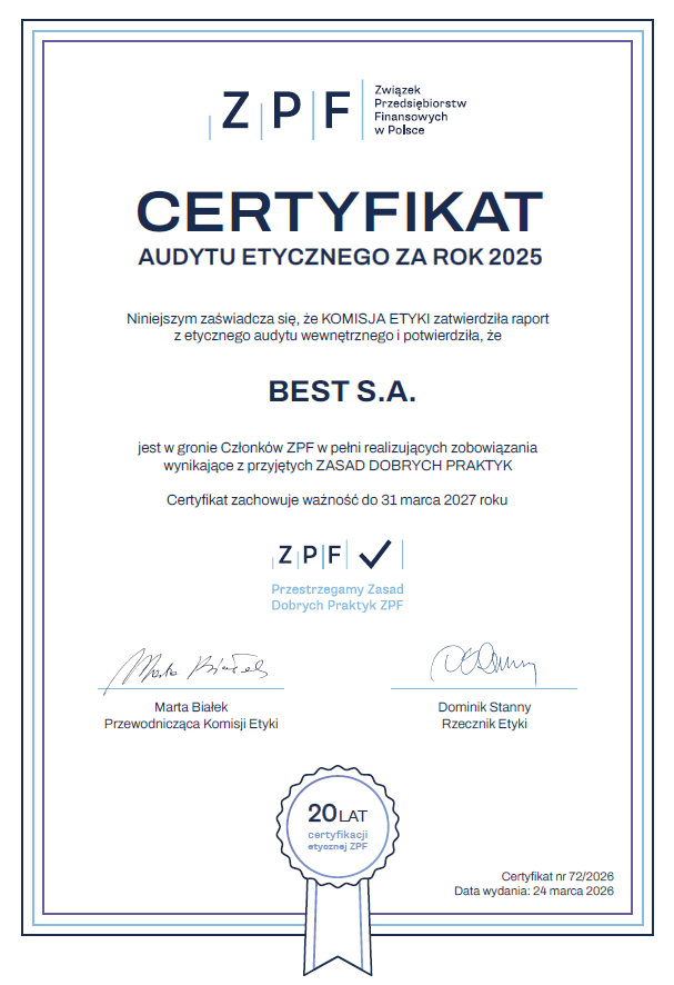 Jako Członek Związku Przedsiębiorstw Finansowych w Polsce (ZPF) raz w roku przechodzimy audyt etyczny, prowadzony przez Komisję Etyki ZPF, sprawdzający stosowanie się do Zasad Dobrych Praktyk. Powyższy certyfikat potwierdza, że przeszliśmy audyt z wynikiem pozytywnym.